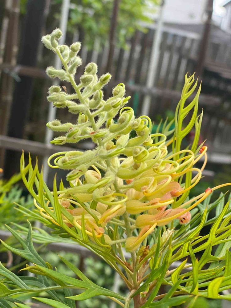 グレビリアピーチズアンドクリームの花が開いてきました。