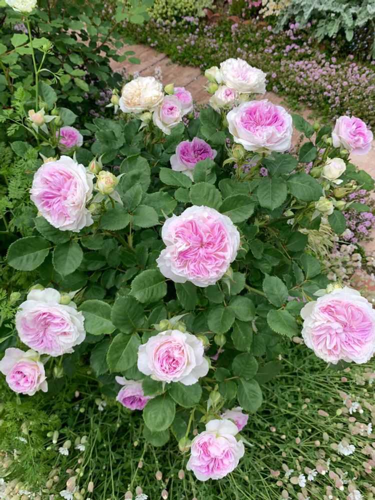 🌹はもちろんだけど、下草のシレネとタイム??が バッチリ合っててステキだなぁ〜(ღ˘͈︶˘͈ღ)✨🤍🌸🌿✨