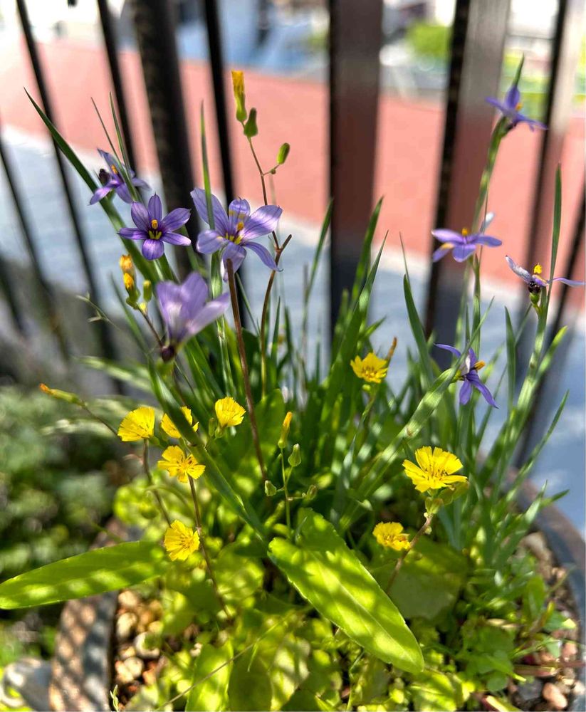 日除けの下の3段花台の上の棚で、💜のニワゼキショウが咲き始めました。🌼のオニタビラコは毟ったらちょうど丈が小さく花をつけました。またむしりますけどね😤