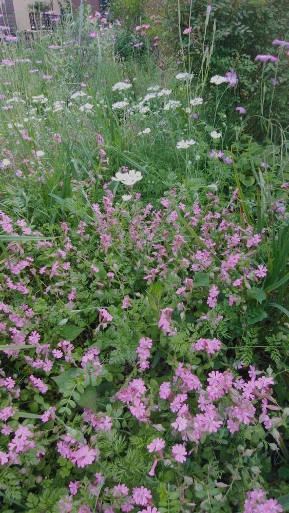 シレネ、オルレア、アグロステンマの零れ種から咲く風景