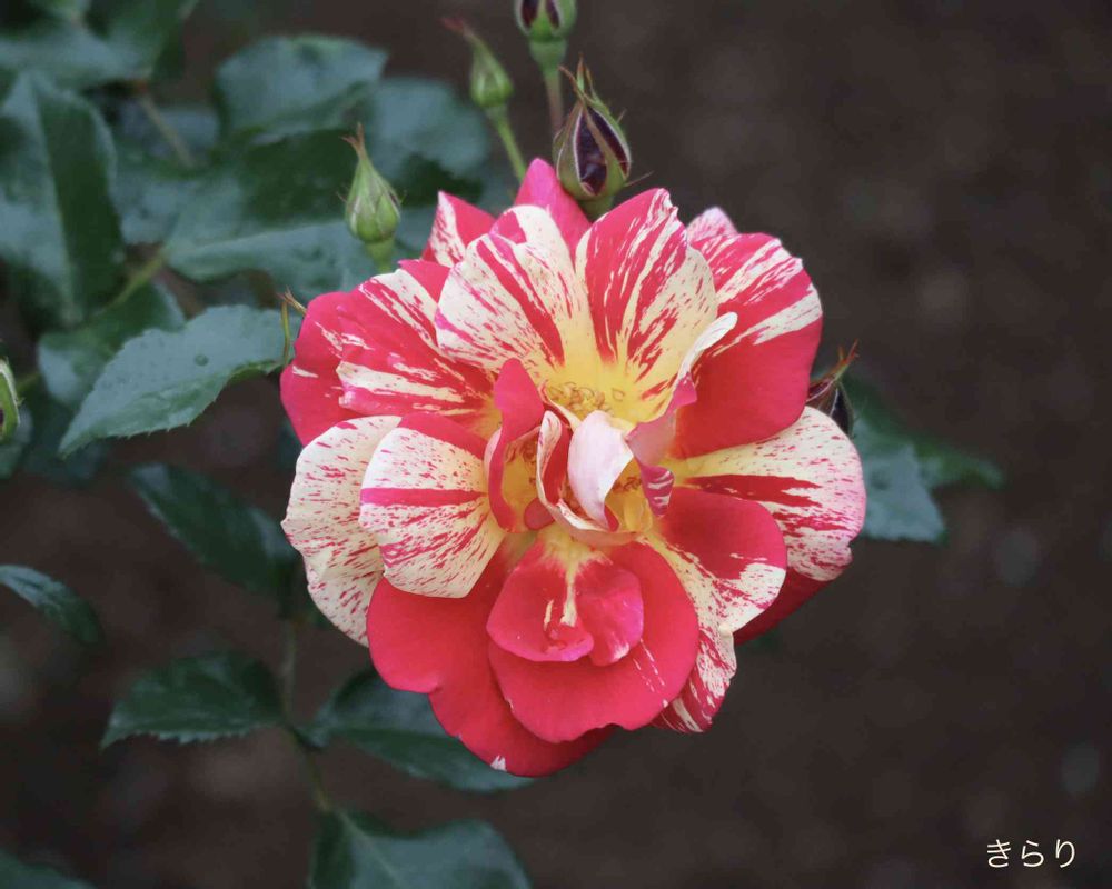 鮮やかな黄と朱赤の絞りからローズピンクとクリームの絞りに変化します。
