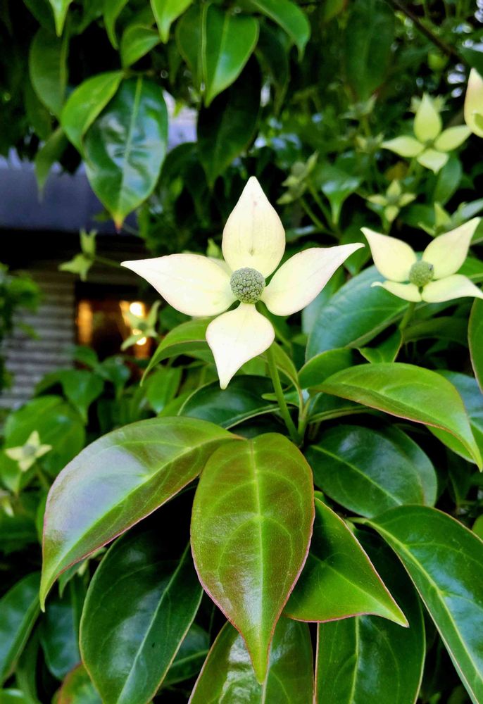 レストランの窓際に常緑ヤマボウシが咲き始めました。