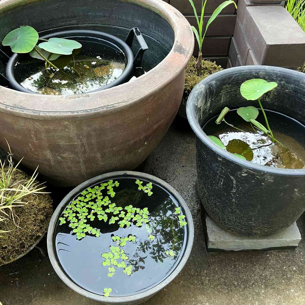 メダカの稚魚が増えてきたので幼稚園鉢を急遽立ち上げ。ウキクサは最初はいい感じでもそのうち繁茂して絶対後悔する。