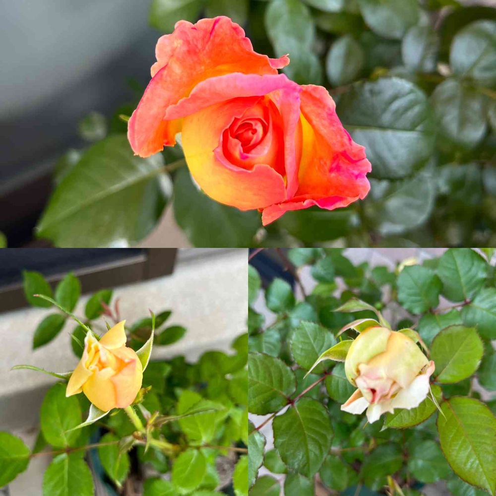 エルさんは色の変化が興味深い薔薇さんですね。咲きはじめは濃いオレンジ❓朱色❓なんですが、花が開いていくとなんとも柔らかいコーラルオレンジがメインになります。そしてだんだんピンクに近付いて終わります。香りも素敵なんですよ😄