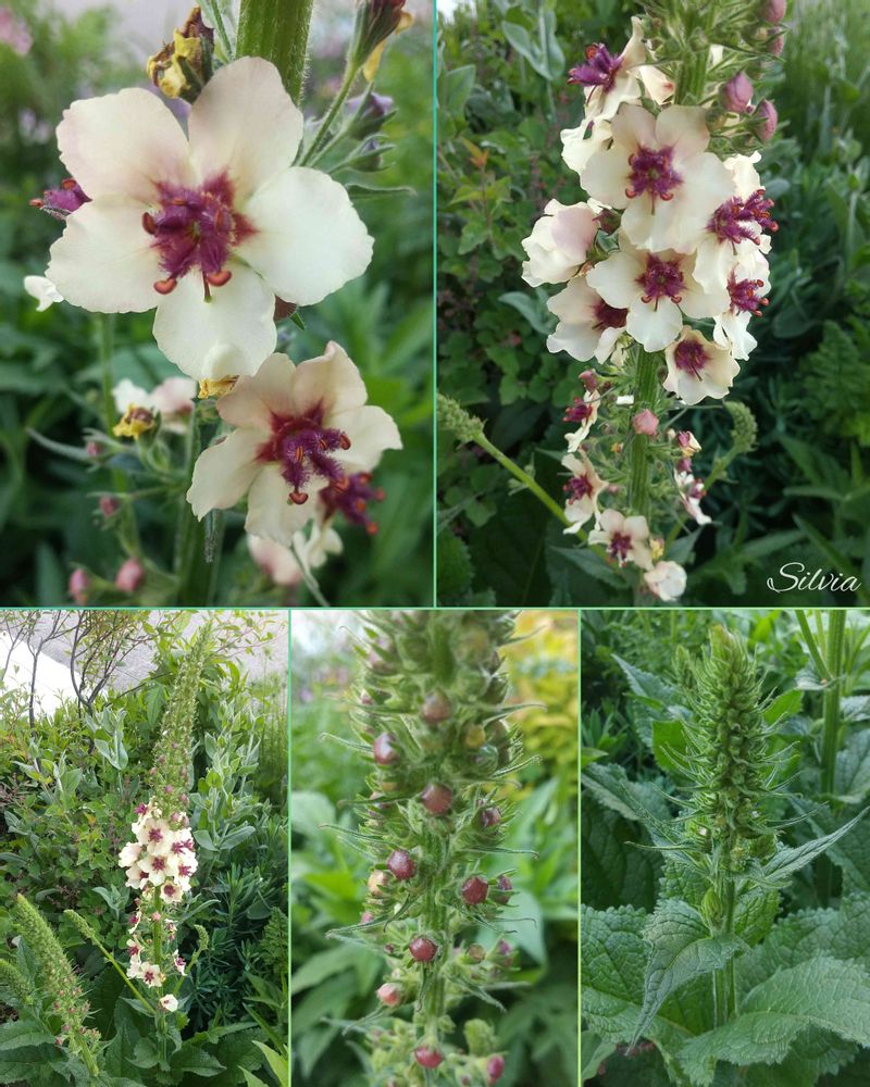 Verbascum chaixii ‘Wedding Candles’シェクシータイプの園芸品種。花穂が大きく花が密生する。乳白色で花糸は紫色。