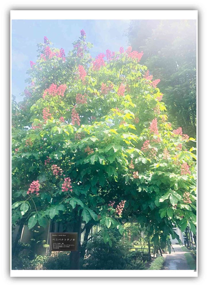 📝この写真画像は、直前に投稿した「西洋の薔薇の館」から出てすぐの路地の所に植栽されている「ベニバナトチノキ:紅花栃の木」の花が満開に咲いていました。