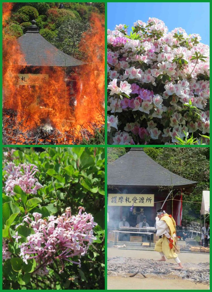 躑躅満開で見た4年前と比べるとちと寂しい背景となりましたが、山伏たちが吹き鳴らす法螺貝の吹奏と共に柴燈護摩供厳修者一行が 行列参進し結界が張られた道場の手前で入山資格が有るか否かを 見極める儀式作法の山伏問答を行った後、結界が解かれ入場する。