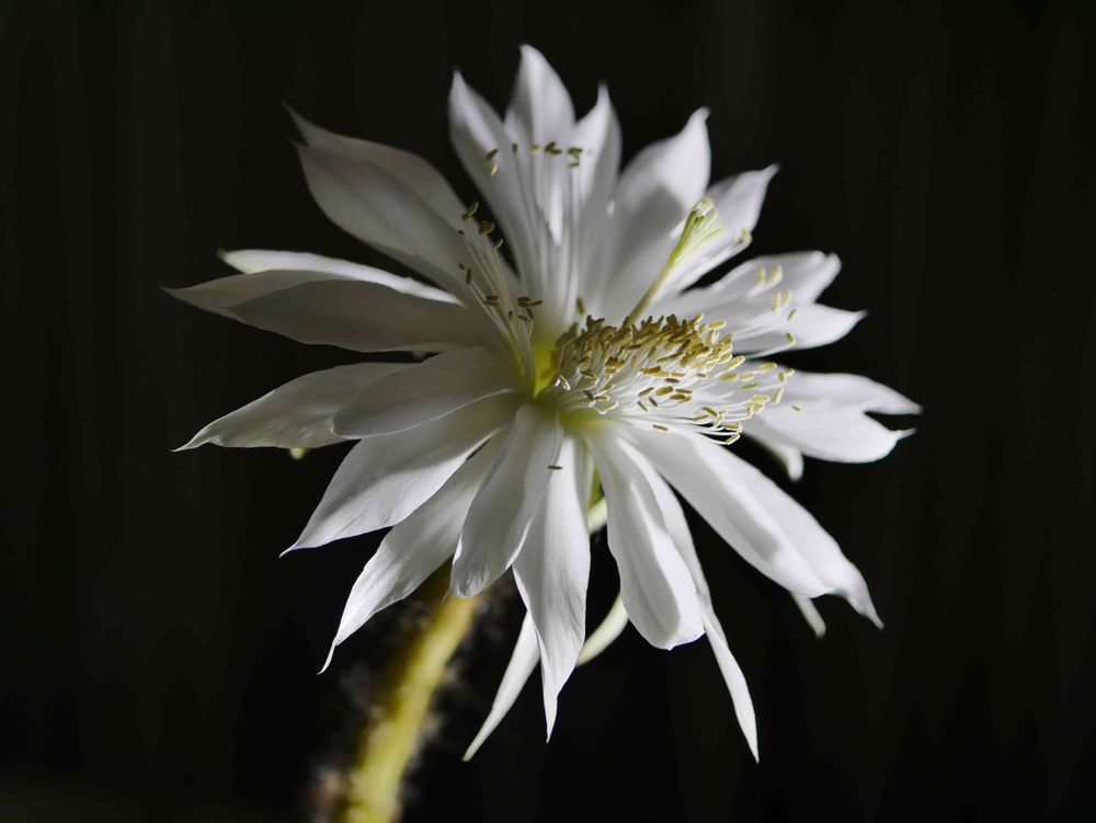 さん、はい^^*普段はチクリチクリと私の指をやっつけてくれるのですが、この時だけは、でかしたぞ!!と誉め称えております(笑) 夕暮れ時に開いて、午前中にはしぼんでしまう儚い花です。もう今はぐったりと長い首がうなだれております。蕾の期間も長いのに、咲いているのは一夜限りなので、見逃さないようにしないと。。気付いたらぐったりなんです(;>_<;)アチャー
