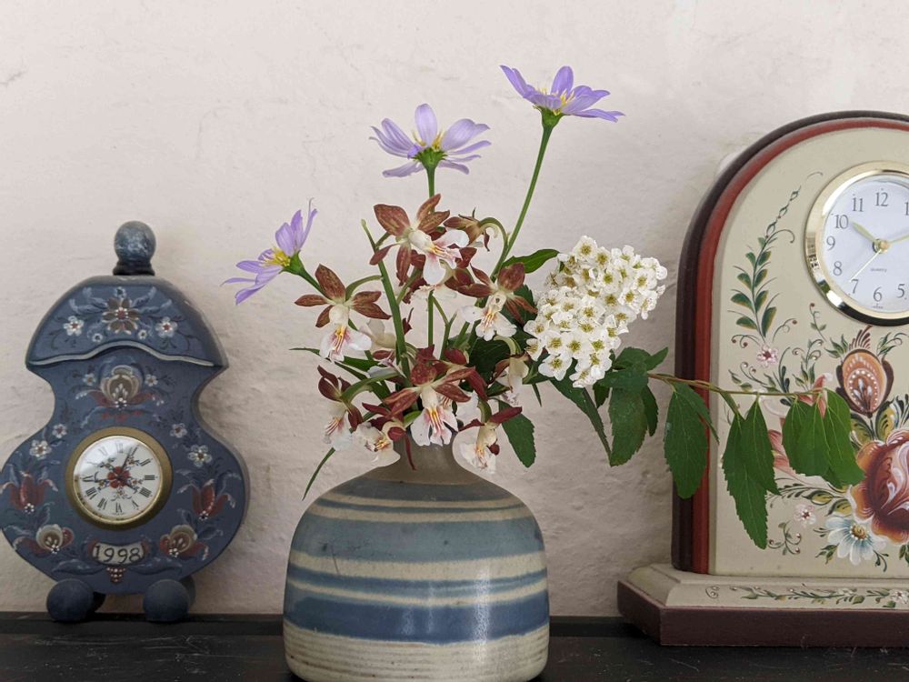 素敵な花瓶に素敵な庭のお花たちが入りました。さりげなくてとてもいいと思います。エビネは比較的他の花と合わせるのが難しいのですが、静かなミヤコワスレを持ってきて正解でした。