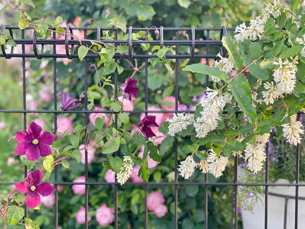 色濃いクレマチスの向こうに 優しい色の薔薇が透けて 右のライラックは爽やかな白でなけりゃ〜