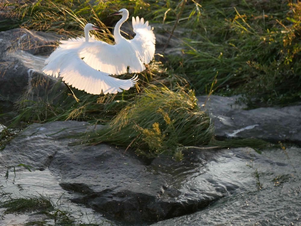 急な流れが分断されて狭くなり水の流れが若干緩まったところが小型のサギさん達にとって狩りのベストポジション。