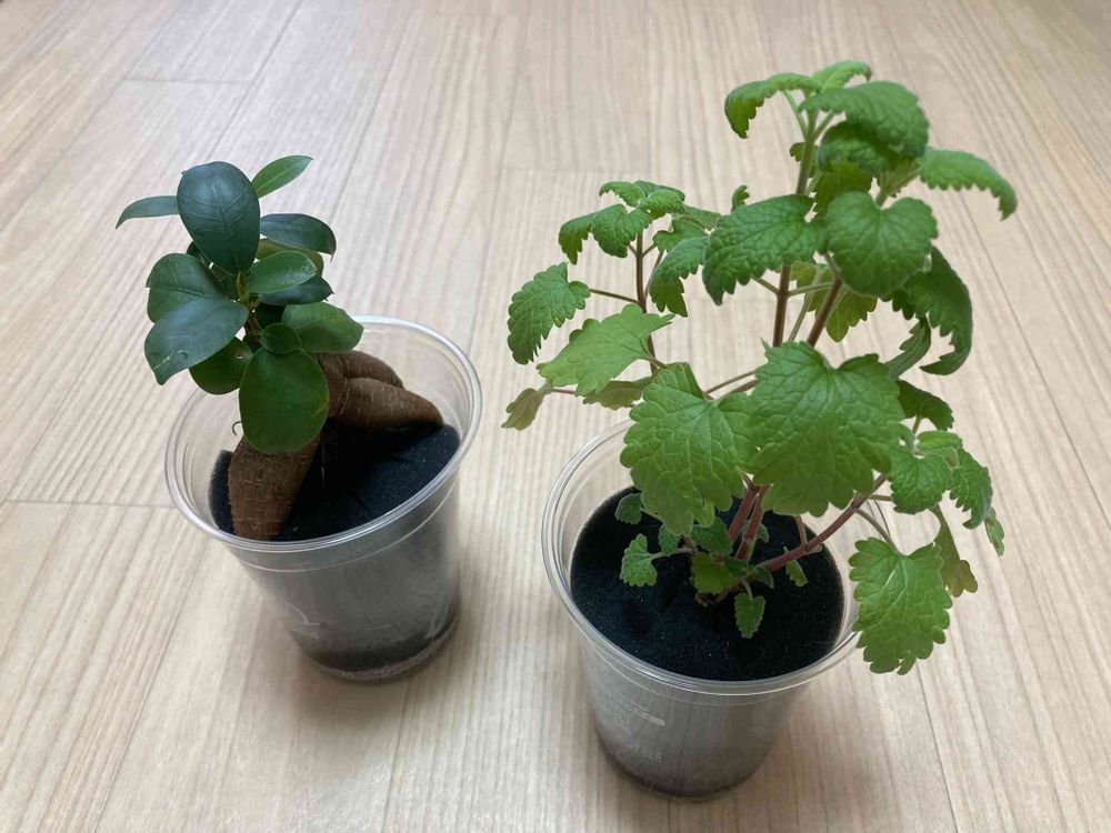 テーブルプランツのガジュマルとキャットニップ。なるべく陽に当て、水もやりすぎないようにしてますが、葉が丸まってシャキッとせず…。新芽はゆっくりですが出てきてます。ヤシの木は窓辺に置かずとも葉がピンと伸びて元気でした。