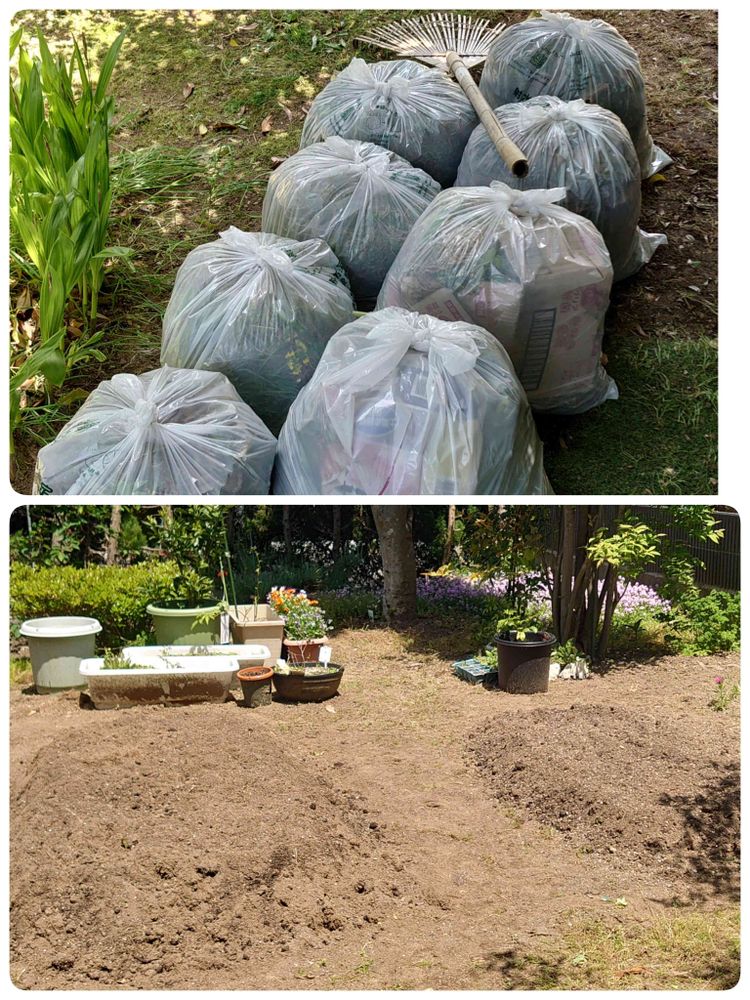 小さな庭,雑草を詰めた袋,綺麗になった小さな畑の投稿画像