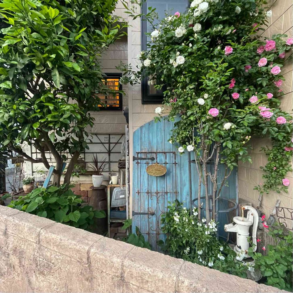 サマースノーが咲くと 毎年この角度で撮影しています❁⃘*.゚本当はホワイトコーナー目指してるのにピンクのバラが…😑これは元々1本の白いバラですが 突然変異でピンクの要素が多くなっています💦足元にはクレマチスがありますが今年は咲かず…😩