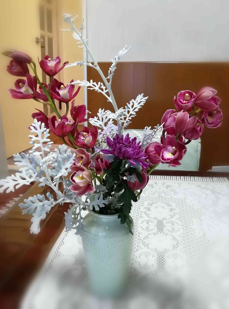 シンビジュームと大きくなったシロタエギクで活けて見ました🤗
