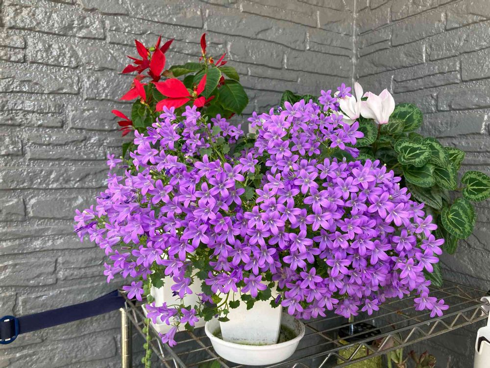 モリモリのベルフワラーさんのリボンの様に咲いてるのは、シクラメンとポインセチア😁💕