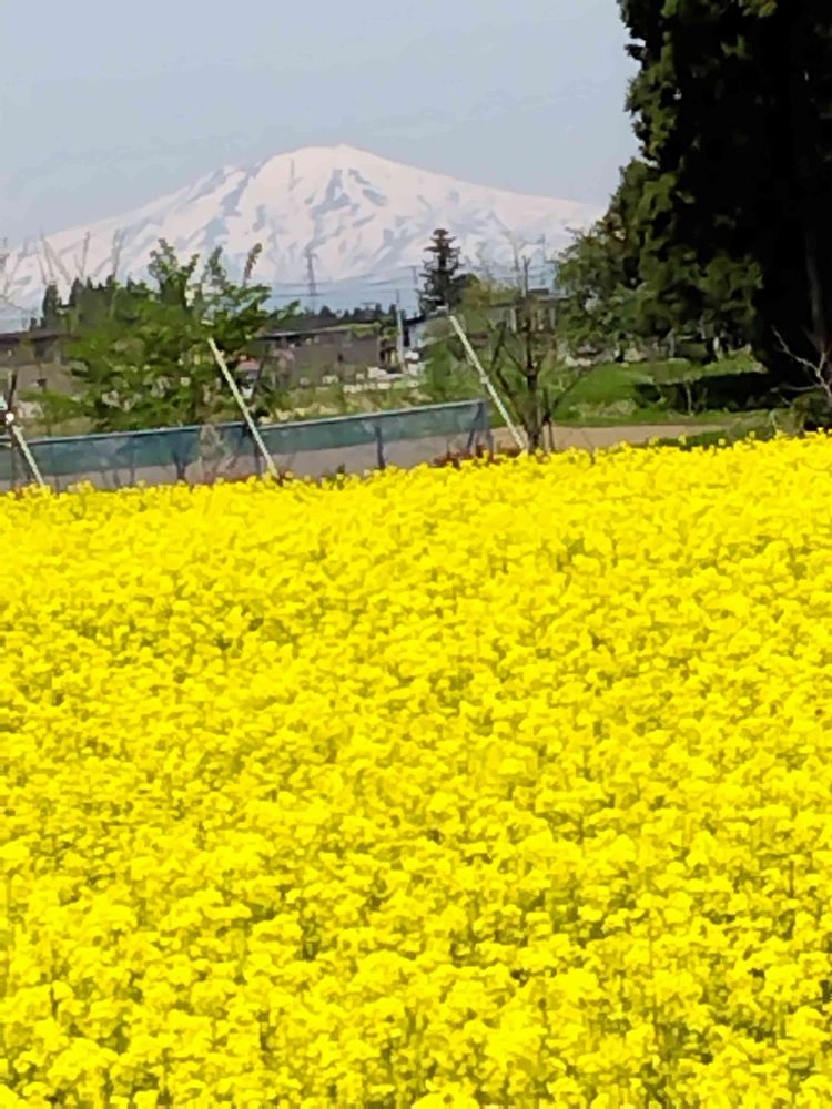 近くの菜の花畑と雪の鳥海山今日は良く晴れてとても綺麗ᐠ(∗ᵔᗜᵔ∗)ᐟ乙デシタയꕤ*.゚