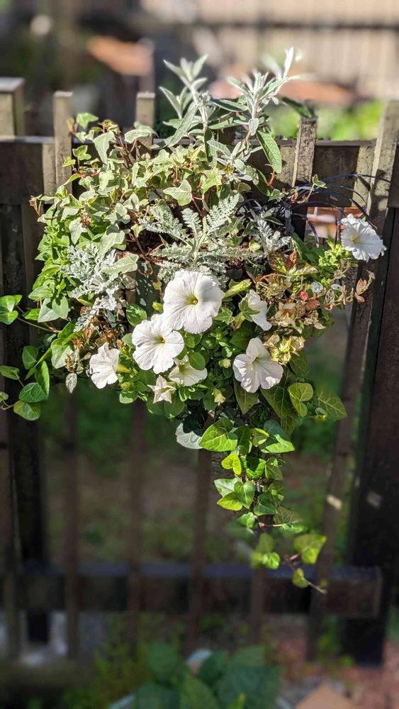 夏のハンギング。植込みから2週間でようやく隙間が埋まってきました🌿🌿咲き出したペチュニアとヘデラとハツユキカズラの新芽がフレッシュな共演🌱