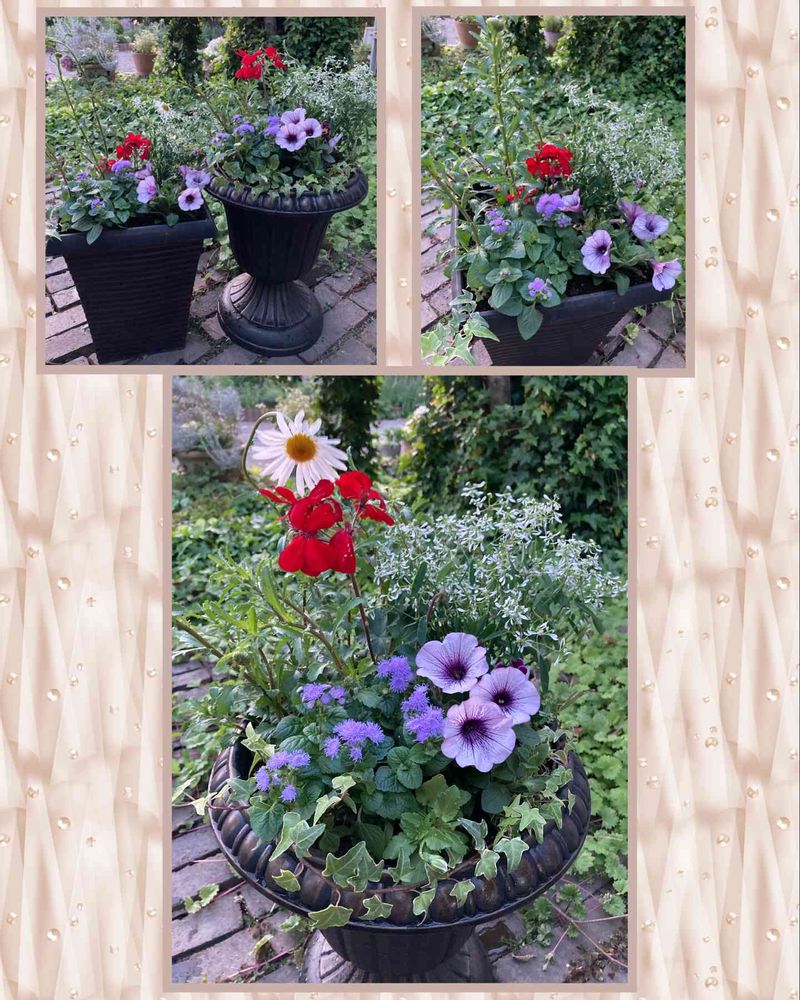 花材: ペチュニア ビビットブルー・アゲラタム・ゼラニウム ハッピーブーケ ダークレッド、ユーフォルビア ダイアモンドフロスト・庭のフランス菊・庭のアイビー・種蒔きビオラ🤭🪴
