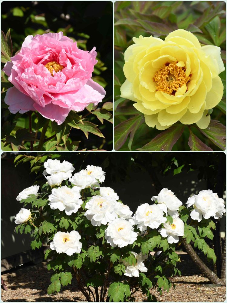 和の庭に咲いている牡丹です😊 年々株が大きくなり、今年は黄色と白が30輪くらい、ピンクは10輪程が咲きました😀 今年は例年よりも開花が早いようです☺️