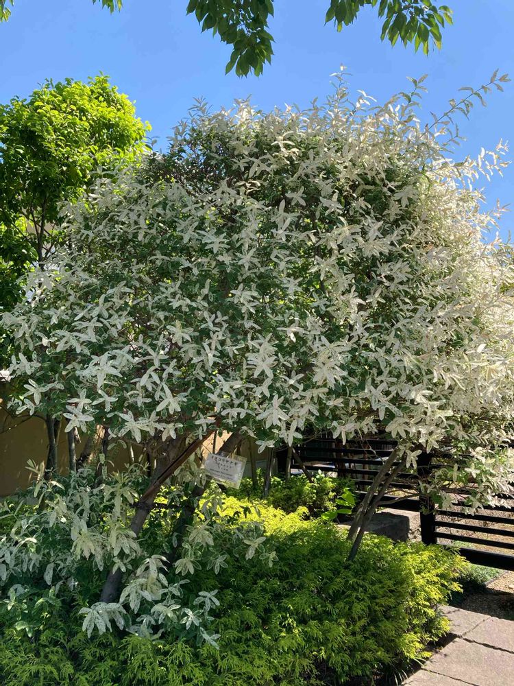 写真の木は盆栽美術館の前に生えていた美しい🌲 白いのは花かと思ったら葉でした😳