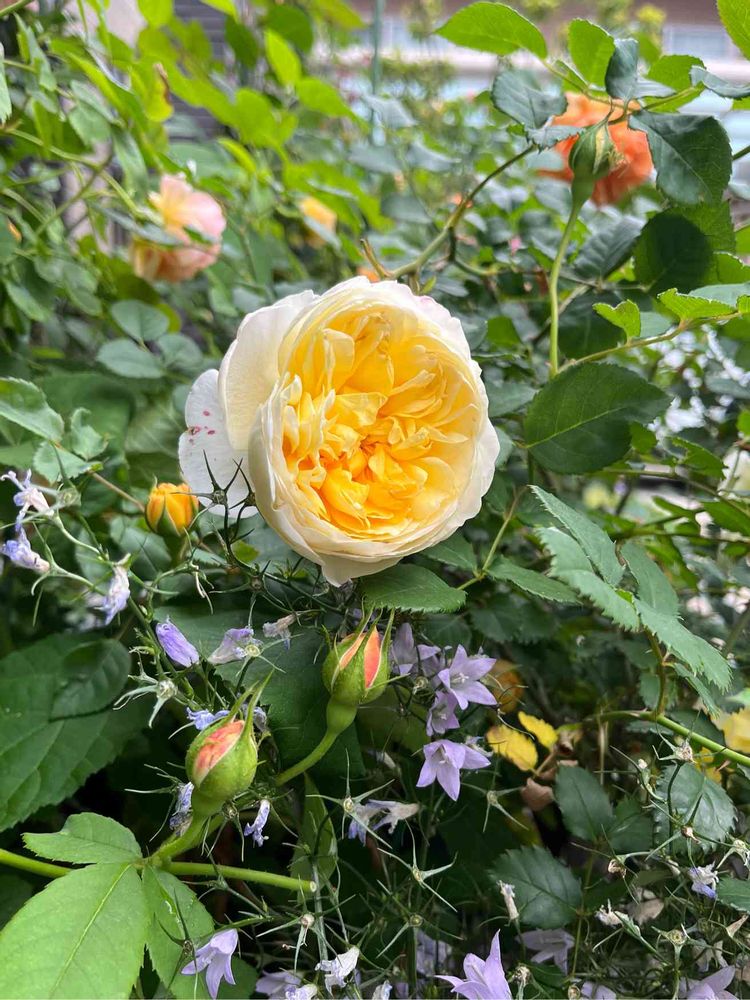 ERのポエッツワイフ🌹中心からのクリーム色のグラデーションがとても綺麗なんですよ😊足下はカンパニュラ涼姫✨涼姫の名前にぴったりの可愛いお花が沢山咲いています♪