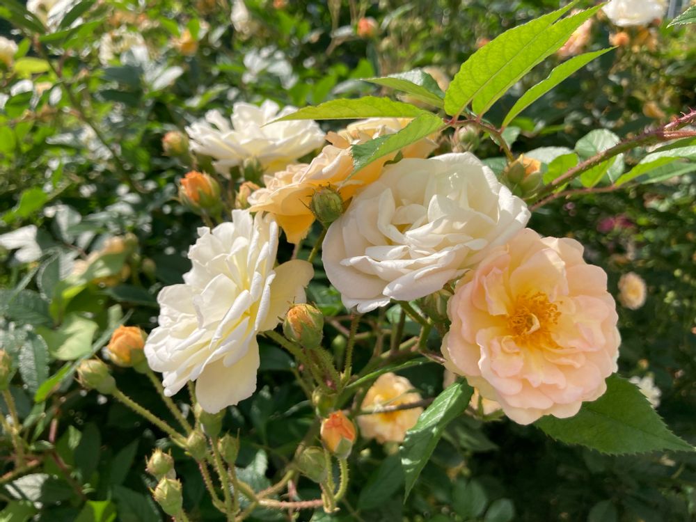 白、クリーム、アプリコット、たまにピンクが混じるような咲き方が可愛いバラ🧡