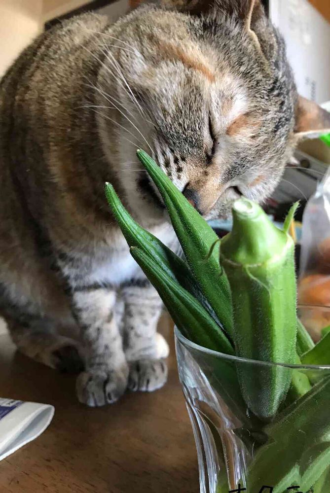 朝からオクラを堪能しております🐈この後、かじって転がしてクタクタのオクラが放置されていました。まさかオクラまで齧るとは…😅