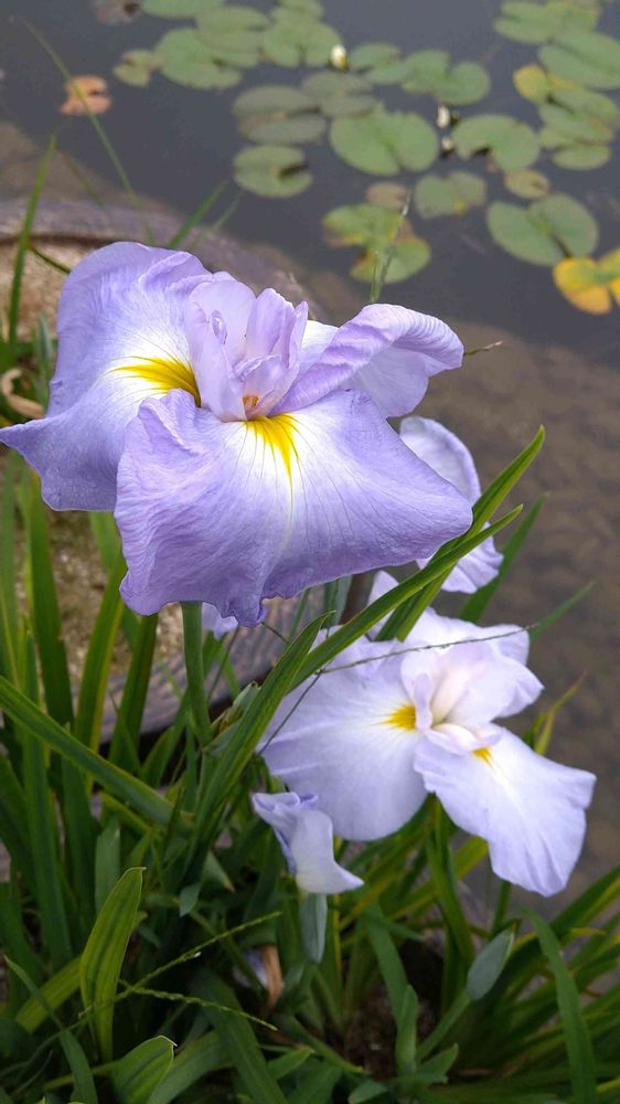 池の辺りで華やかに咲いていた 優しいお色のショウブの花