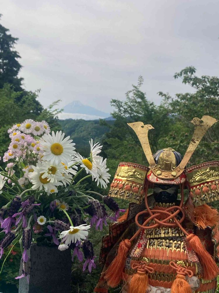 久しぶりに出した家人の古い兜飾りと庭にたくさん咲いたお花達で✨✨