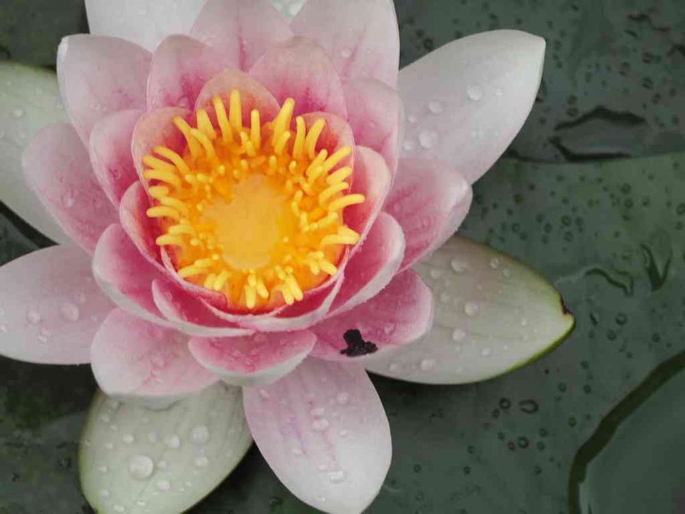 池のオタマジャクシがカエルになって睡蓮の花の隙間で一休み。愛らしいです。