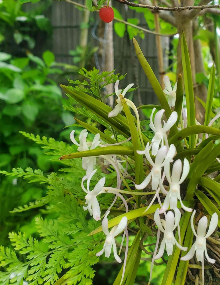 シノブの根で年中ブランコしてるフウランが何故か季節を間違えて咲いてる