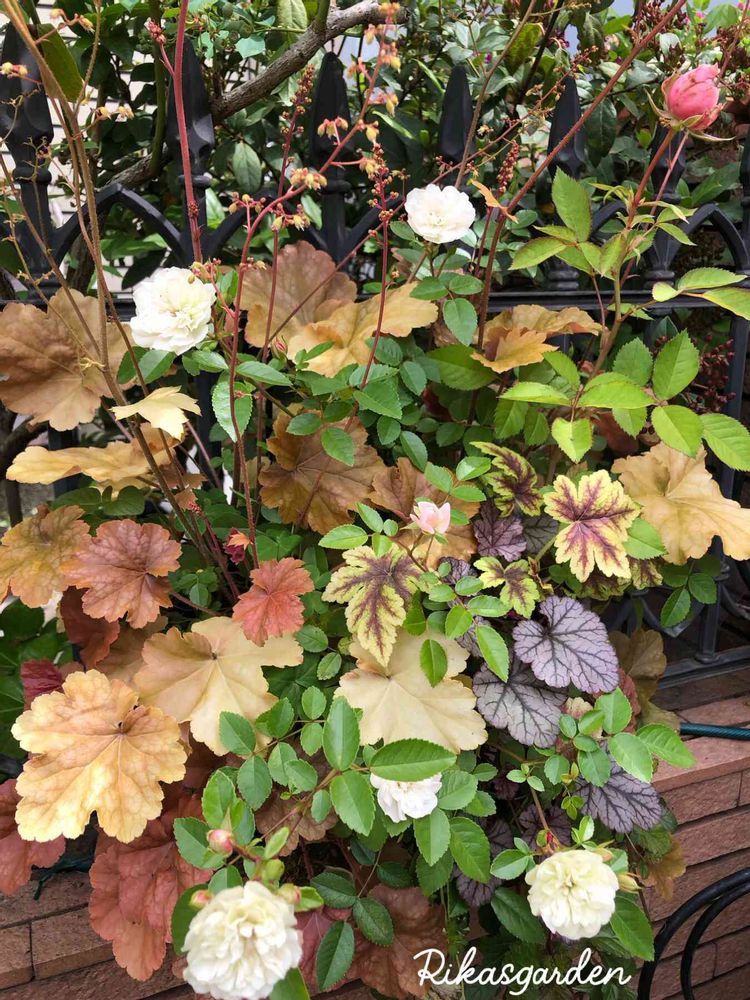 ヒューケラとミニバラの寄せ植えを初めて見ました💓