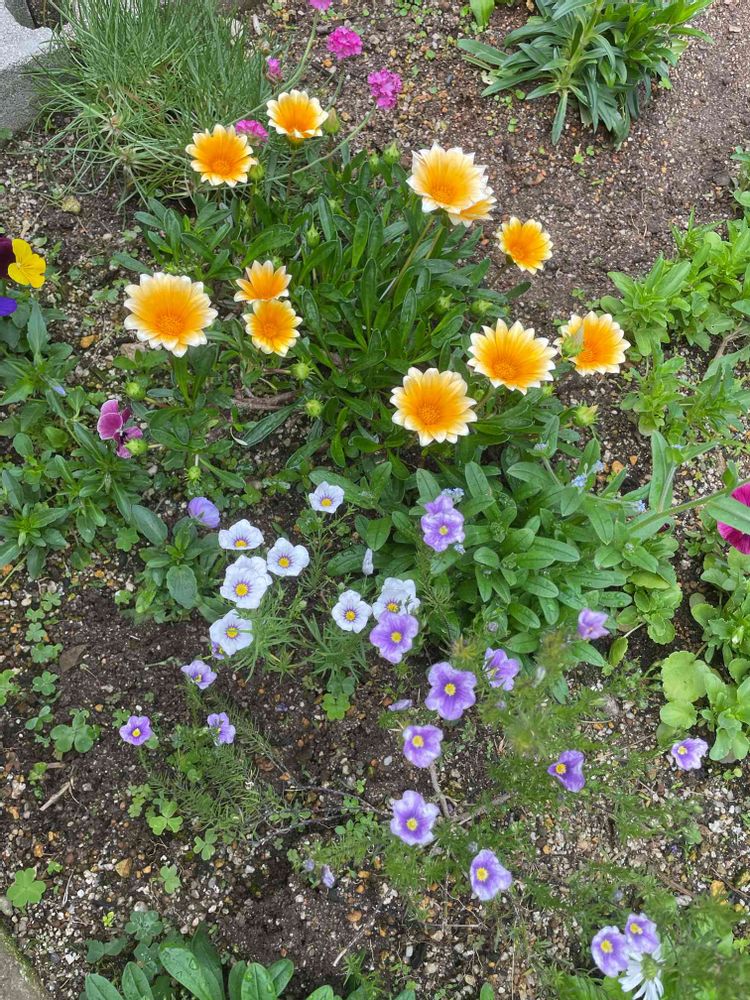 PW2022アンバサダーで頂いた、ニーレンベルギアオーガスタのブルーリングとブルー(写真手前)が2年目開花しました。ガザニアビーストカナリアスマイル(写真奥)も2年目開花。鉢から地植えにしました。