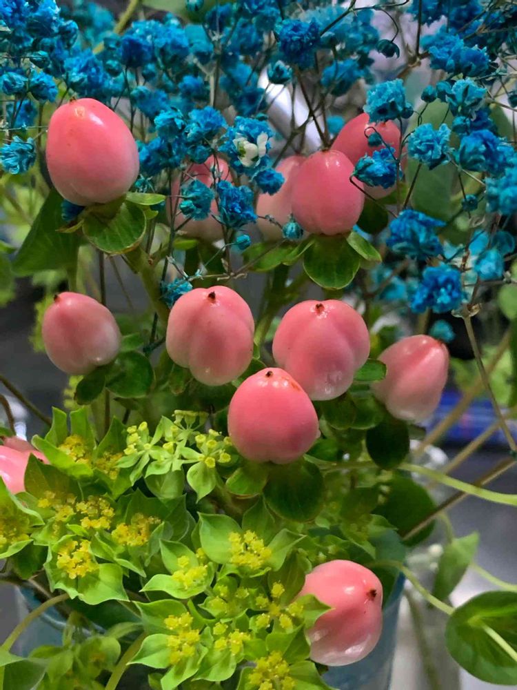 青系のお花だけだと淋しいのアクセントにとピンクのピペリカムをお店の方が入れてくれたそうです🌸💖