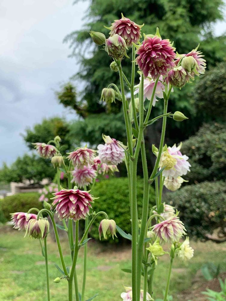 雨まだ降らず、どんより蒸し暑い。去年植えたオダマキ、開花は初めてで背の高い花の姿に毎日釘付けです☺️