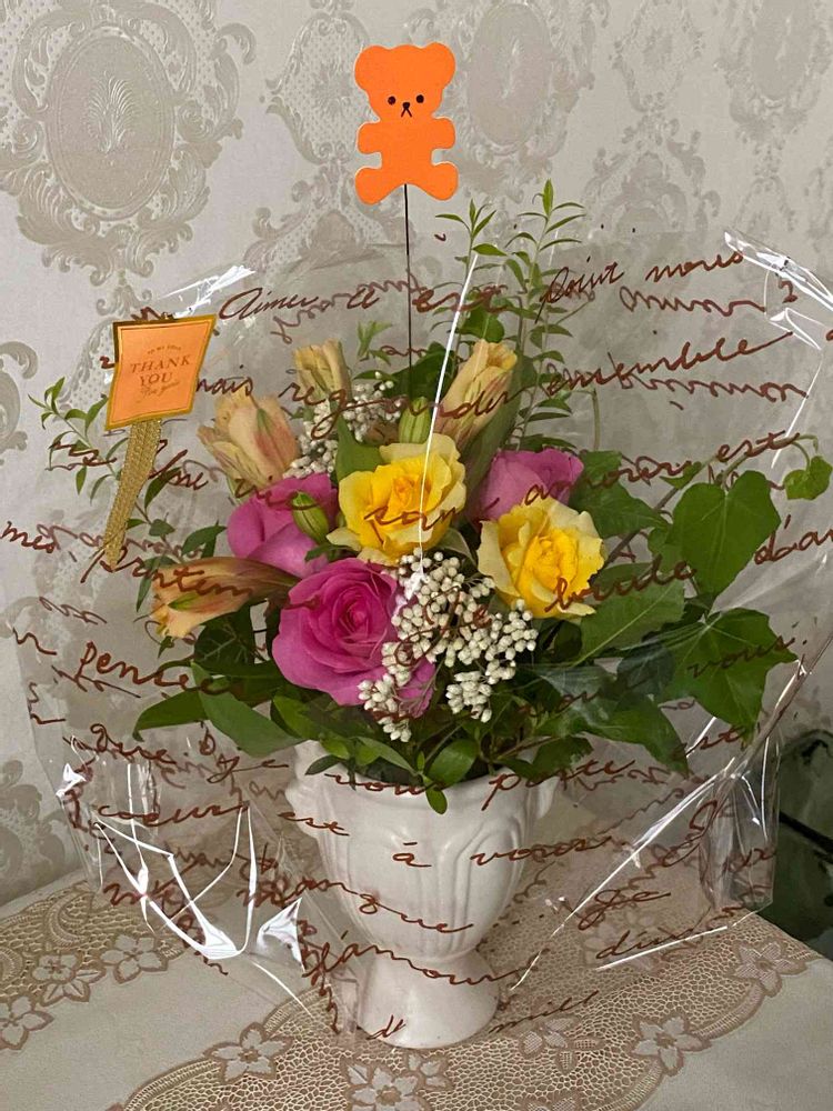 予約いただいてた、ご近所の知的で上品なミセス、Tさんのイメージで作りました。芳醇な香りのイングリッシュローズにクリーム色のアルストロメリア、純白のライスフラワー、ヘデラ等を入れました。