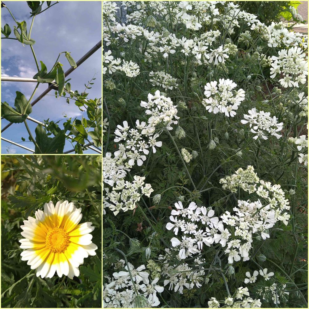 絹さやが上ㇸ上ㇸと🌈春菊の花が咲いてました😁