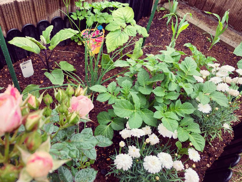真ん中の茂っている葉っぱは芽が出たジャガイモを植えてみたもの‥これからどうなる⁉️