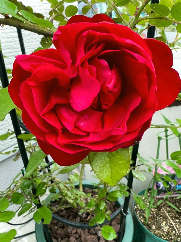 つるバラフロレンティーナ 真っ赤なお花が一輪だけ咲きました♪トゲが凄くて💦