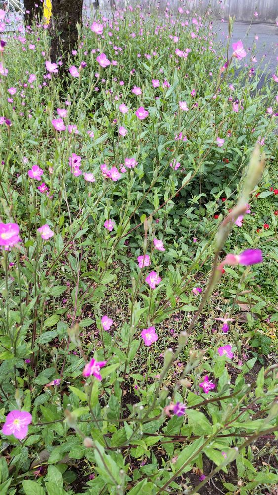 雨に濡れながら、ユウゲショウがたくさん咲いています。