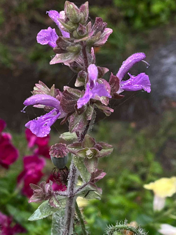 サルビア カナリエンシスランスロット💜🤍アップで💟これポット苗のままなんで本来の草姿はどんなか知りません🤭随分と花茎が伸びた先に割とポツネンと花を付けるのかな?🤔