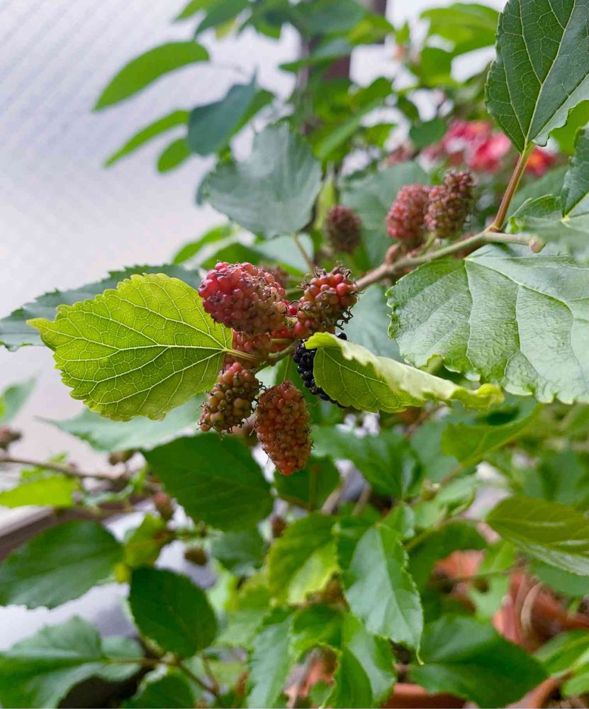 マルベリーの実が だんだん赤くなってきました〜^ - ^