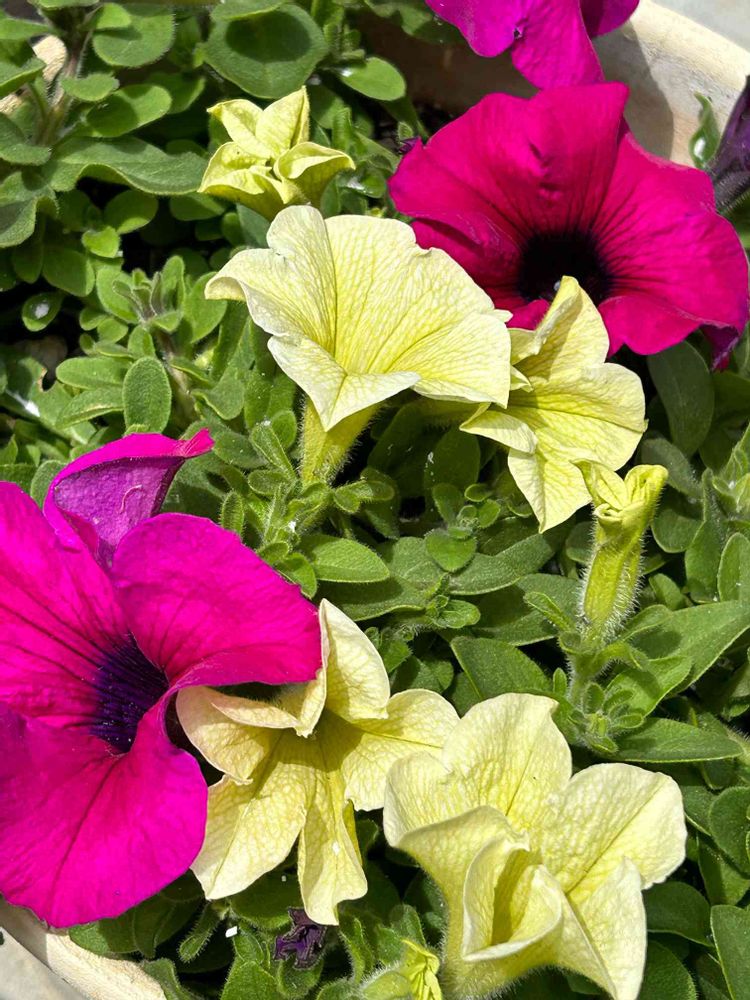 サフィニアのイエローとパープルを一緒に植えている鉢
