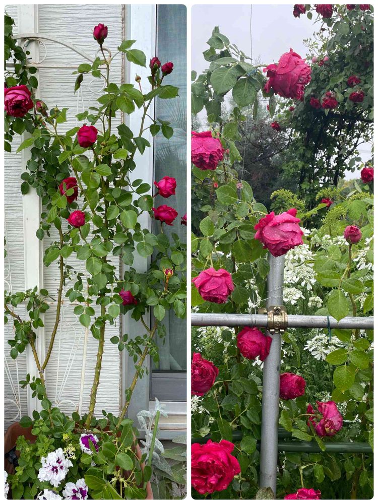 東のフェンスのラレーヌビクトリアあまりに元気がないので急遽抜いて←鉢植えのルージュピエールを植え付けました❤️