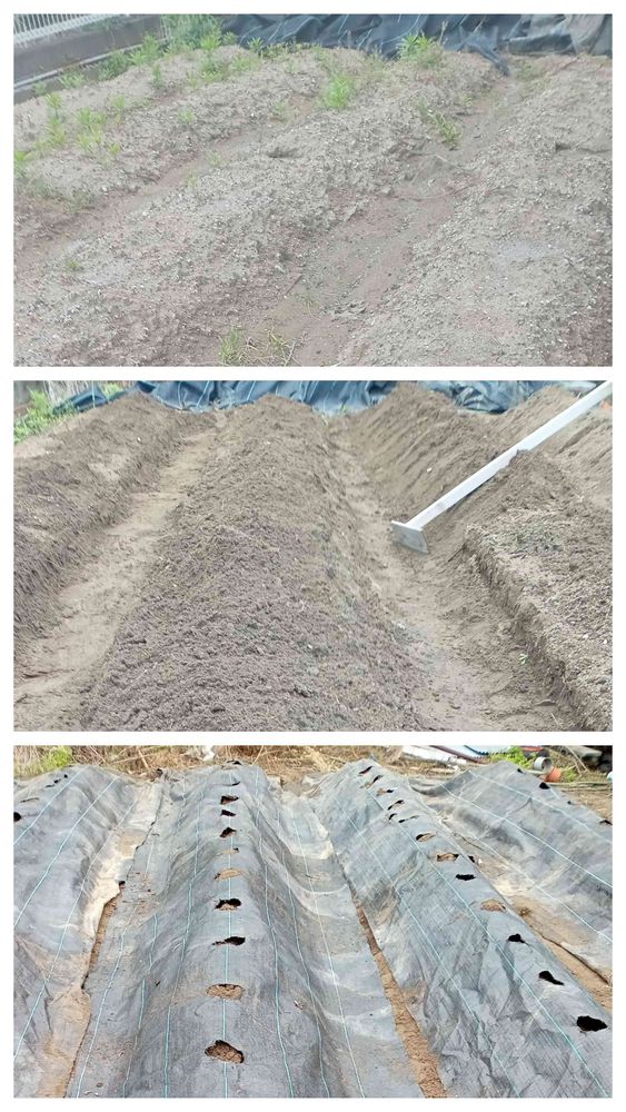 5/8畝立て 鍬で荒立て木で作ったトンボで仕上げ 防草シート(使用5年目)を張ったらペグで止めて後は5/12の苗が来るのを待つだけです 3〜4坪の畑の畝立て一畝ごとに動いた分だけ休まないといけない体になってしまったのが少し残念🤔❤️🎵