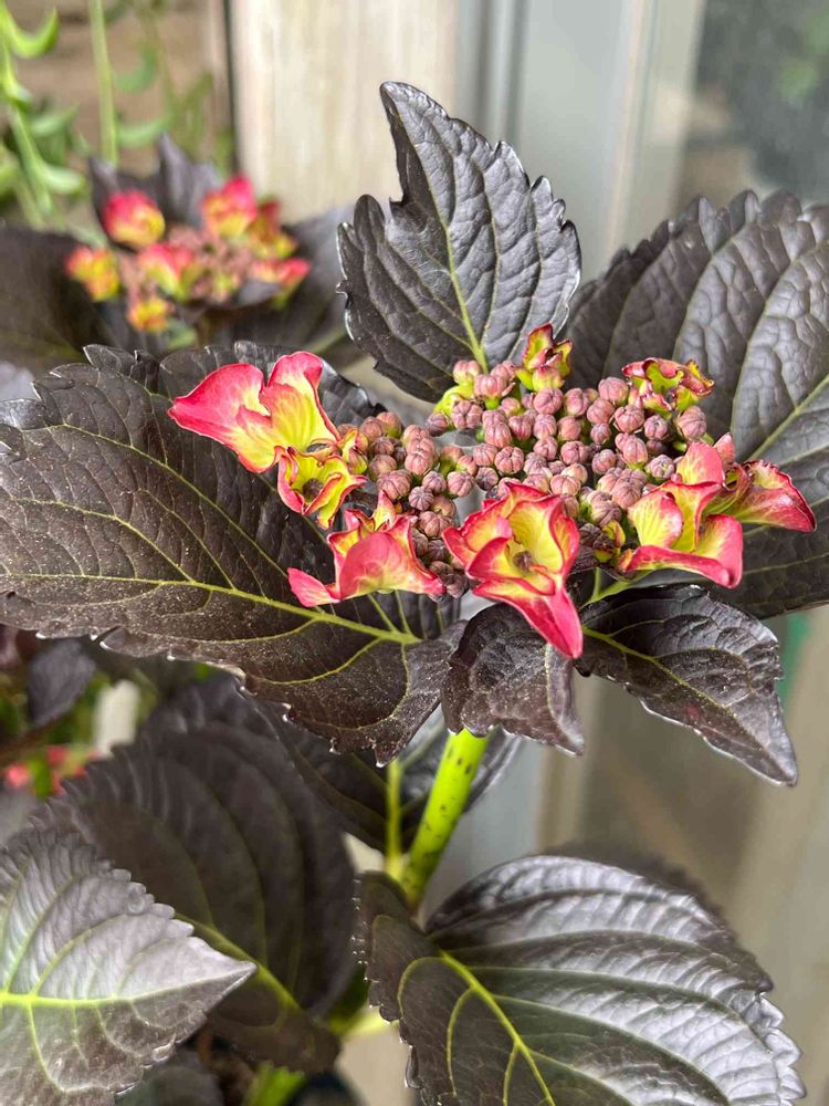 お花赤花ぽいです♪土の酸性度合いで花色変わるそうですよ🩵