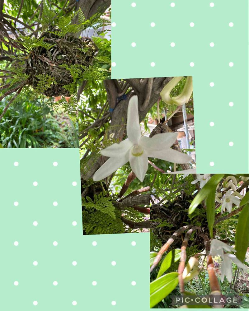 セッコク(長生蘭)の根をハンドボール位の大きさに丸く絡めた物を日陰になる藤の枝に下げてたら真っ白な花を咲かせています。