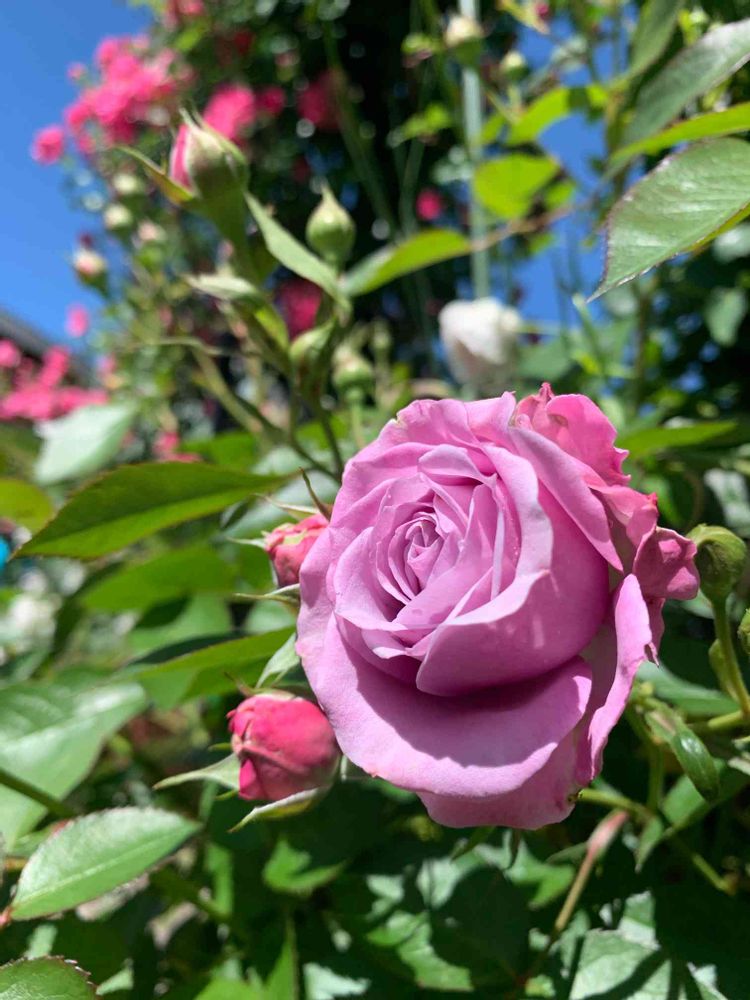株はコンパクトで花付きが良く、春~秋までよく咲き続けます。耐病性にも優れた育てやすい品種。品種名はフランス語の「朝・午前」から。青みがかった色はひんやりとした早朝を、ピンクがかった色は暖かい昼前のイメージ。
