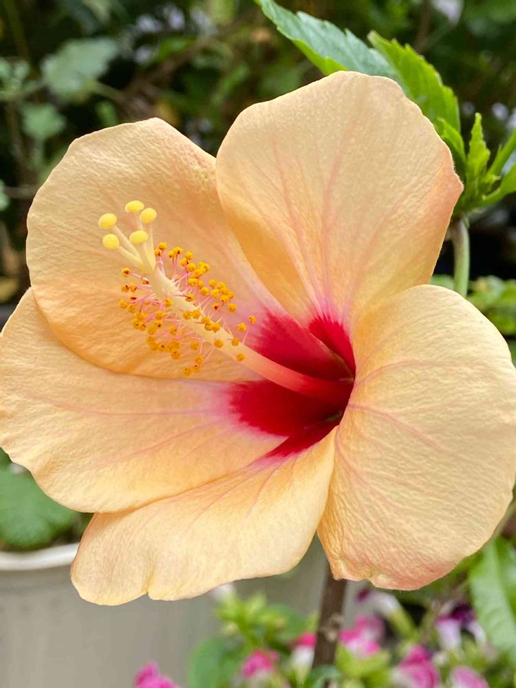 昨日の嵐のような雨に蕾がどうなるか心配しましたが、今年初めてのハイビスカスの花が咲きました🌺